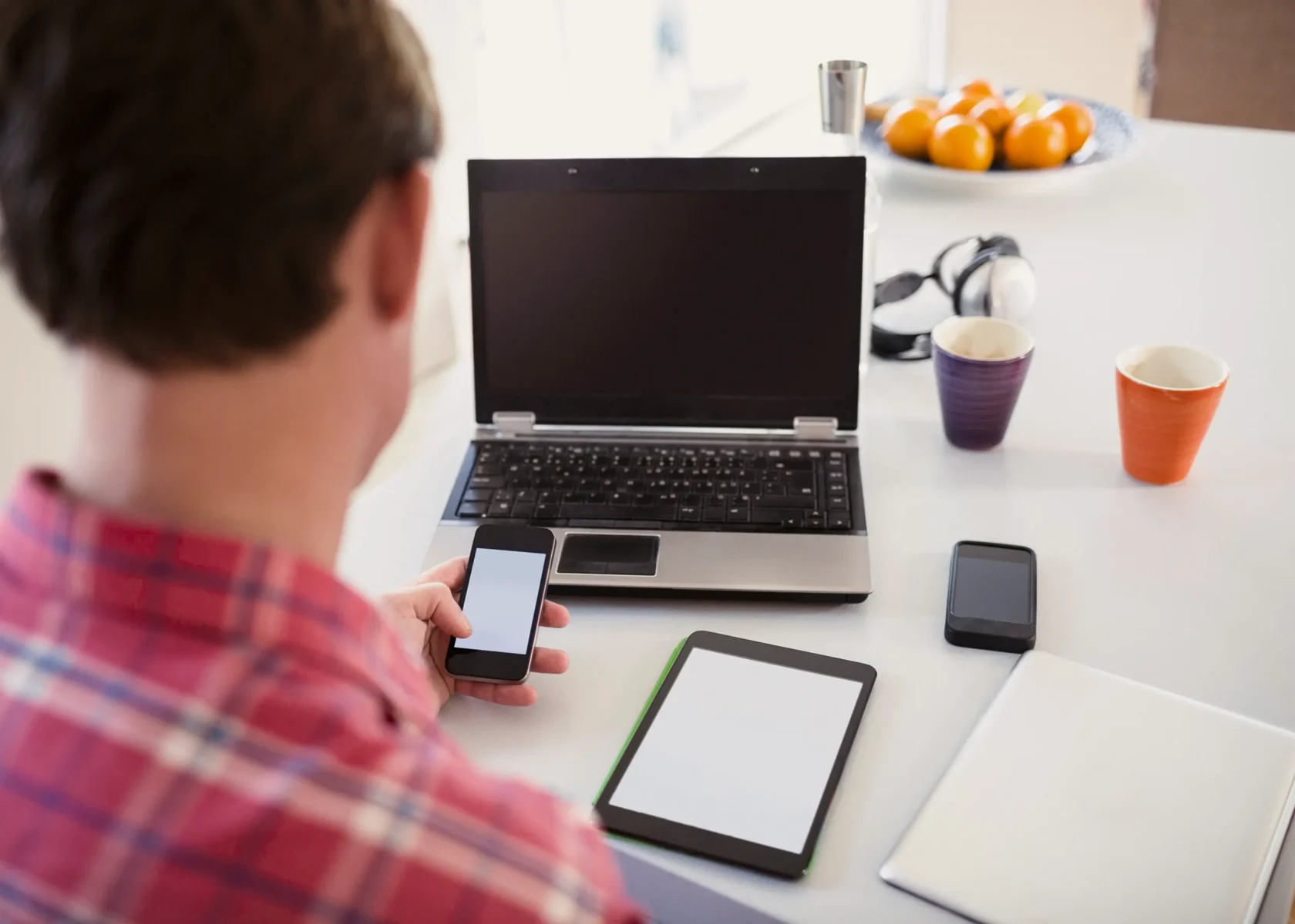 En person sitter vid ett bord framför en bärbar dator och håller en smartphone i handen. På bordet ligger även en surfplatta, ytterligare en mobil, hörlurar, två muggar och en skål med apelsiner.